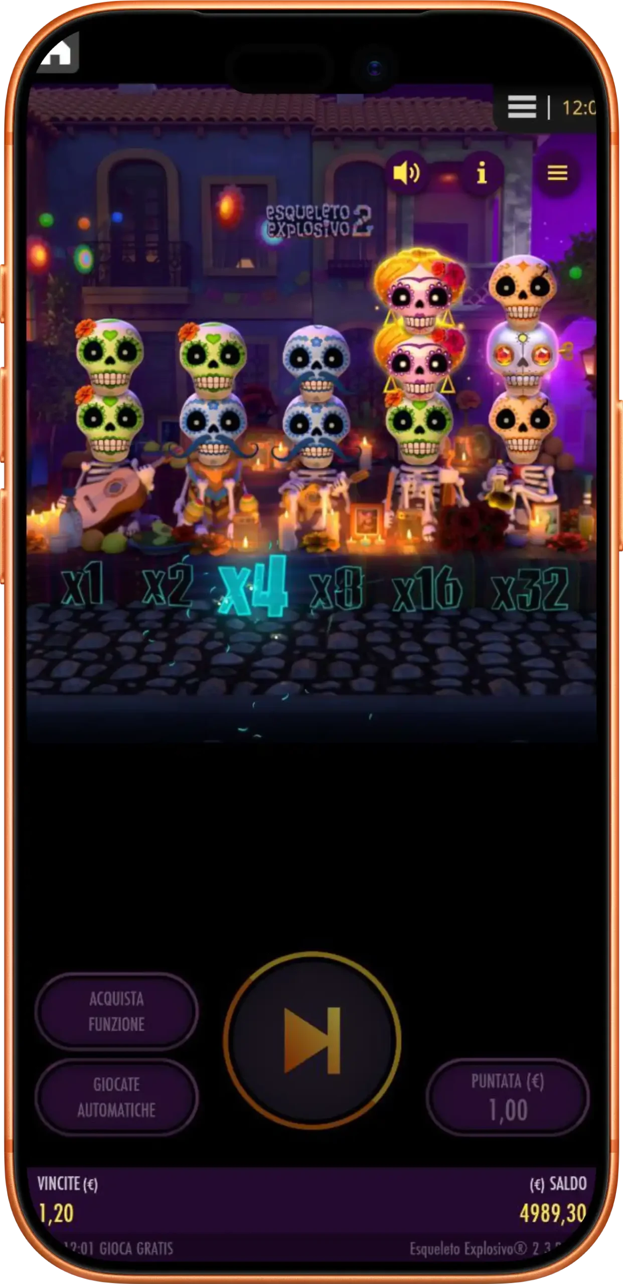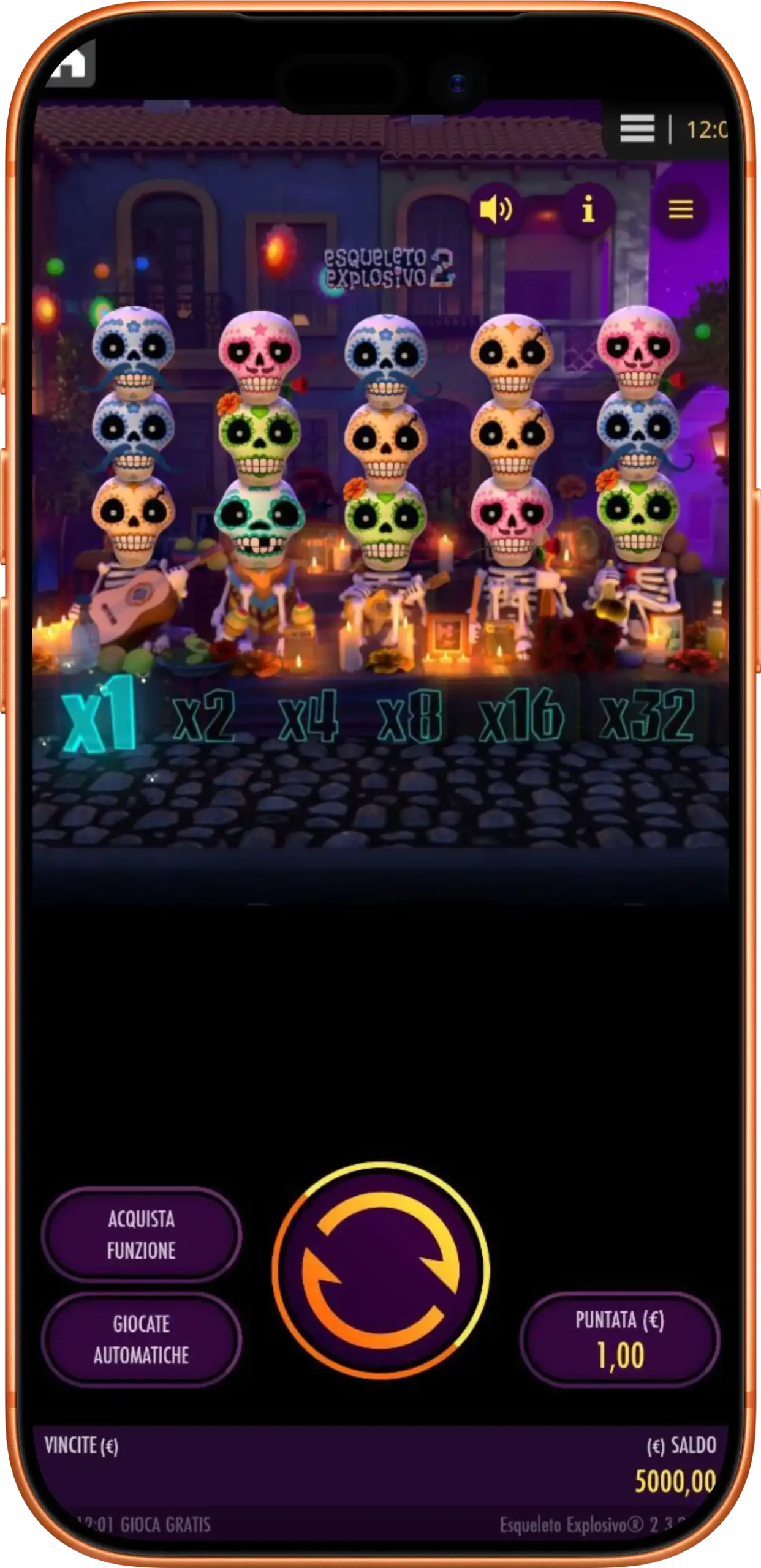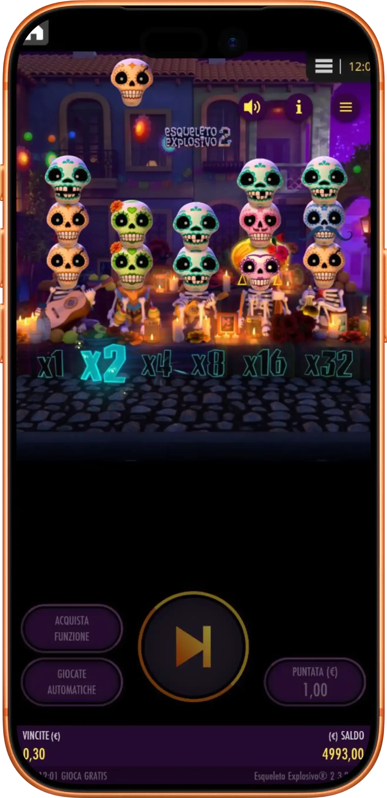 Se durante il round Esqueleto Explosivo 2 bonus compaiono da due a cinque Scatter, riceverai garantiti 3, 7, 10 o 12 nuovi giri. Nel corso dei free spin sono disponibili moltiplicatori aggiuntivi fino a x64.